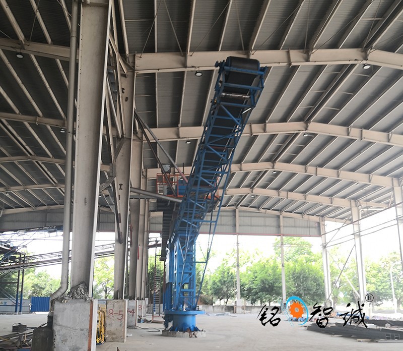 旋轉式皮帶輸送機,為散碎物料倉貯輸送設備,是在安裝有行走輪的支架上部的底盤上安裝一轉盤,轉盤可相對底盤作旋轉運動,皮帶輸送機的進料端座在轉盤頂部的托盤上,出料端為懸臂式,配重箱在托盤上用以上與懸臂配重,倉貯時,物料通過料斗由輸送帶送至遠端,推動懸臂即可改變堆積位置,在庫房內實現多點堆積而勿需停機和移動機體,連續作業省時省力,操作方便,尤其適用于糧食的倉貯輸送。